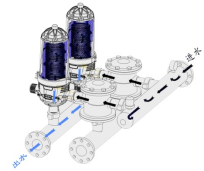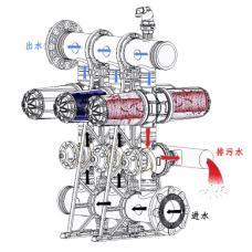 反沖洗階段原理:當達到一定的壓差時,或設定的時間內系統(tǒng)自動進入反沖洗狀態(tài),控制器控制閥門改變水流方向,過濾器底部隔膜關閉主通道,反沖洗進入四組噴嘴通道,和噴嘴通道連接的活塞腔內的水壓上升,活塞向上運動克服彈簧對疊片的壓力,同時反沖洗水從四組噴嘴通道上面的 30*4 個噴嘴沿疊片切線的方向高速噴射,使疊片旋轉并均勻分開,噴洗水噴洗疊片表面,將截留在疊片上的雜質噴洗甩出。如下圖